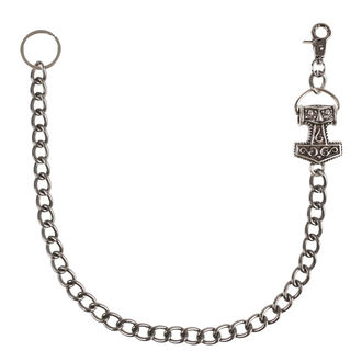 The chain is fitted with a metal carbine and at the other end with a metal strap for attaching keys or wallet, see photo.